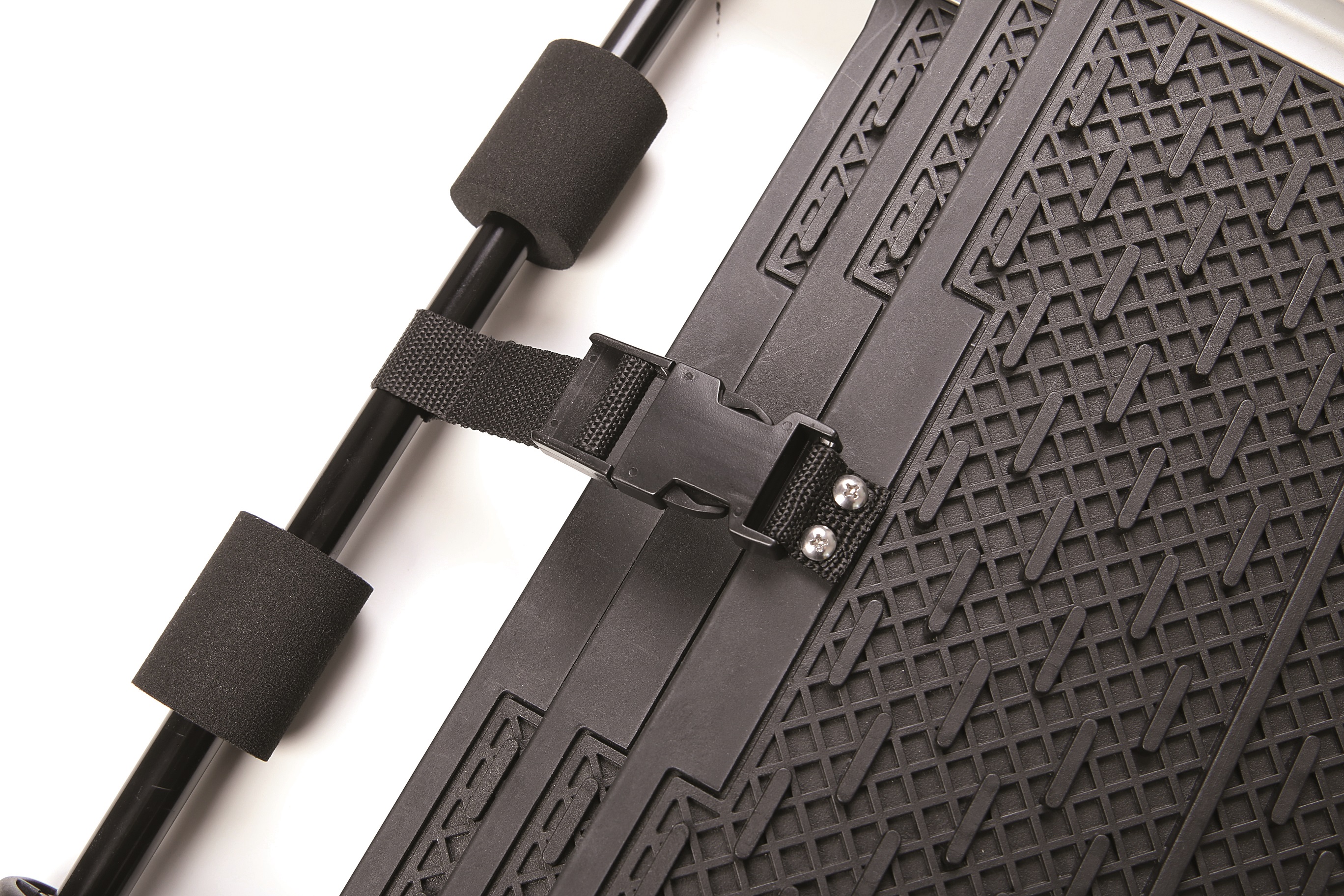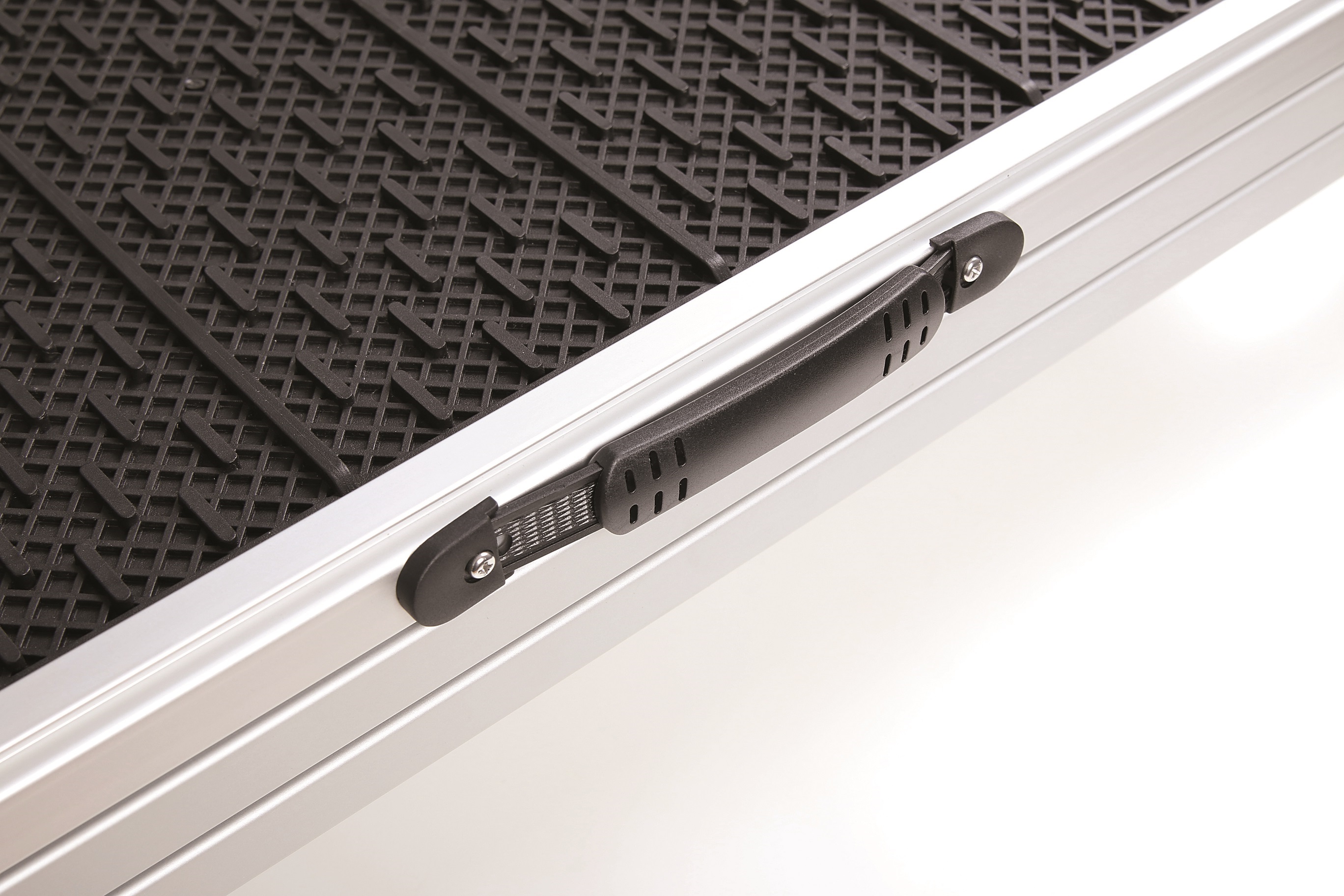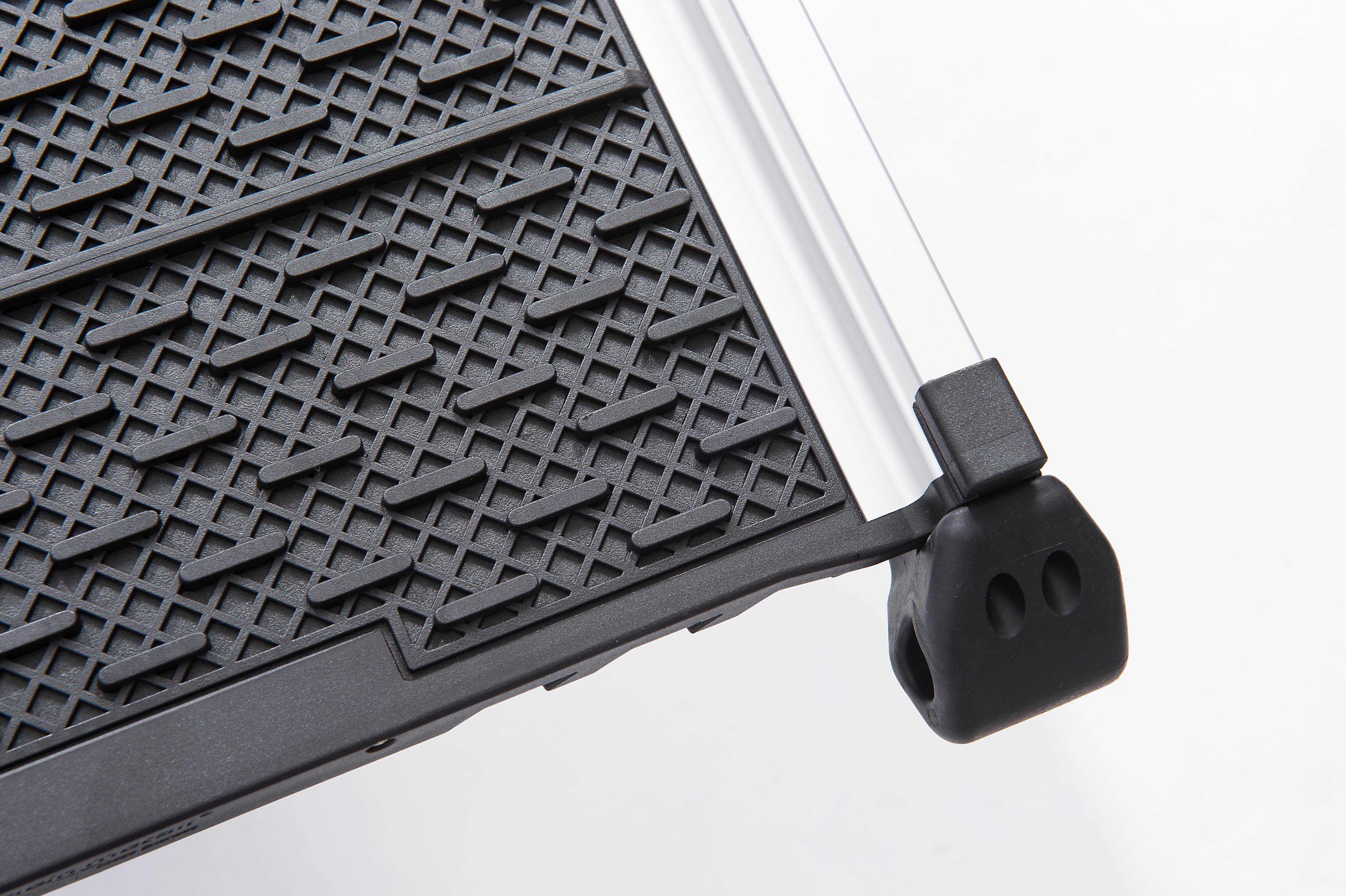 Abgewinkelte Auflagefläche mit Schaumstoffpolster gegen Verrutschen der Rampe und Verkratzen der Stoßstange