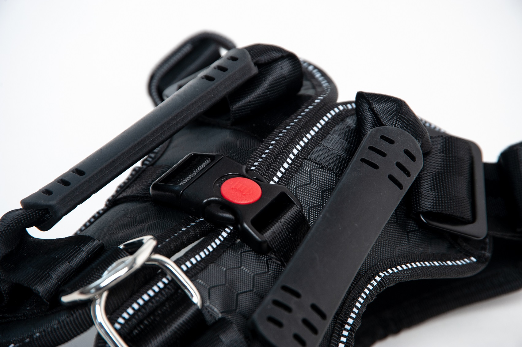 Long, high-strength polyester straps allow each harness to be adjusted to the appropriate body size of the quadruped.Once adjusted, the harness system can be put on in seconds and locked with a quick-release buckle.
