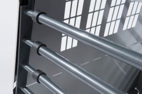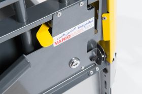 The standard desing of all Variocage boxes includes deformation zone, safety lock, emergency exit, fastening belts and automatic door stoppers.