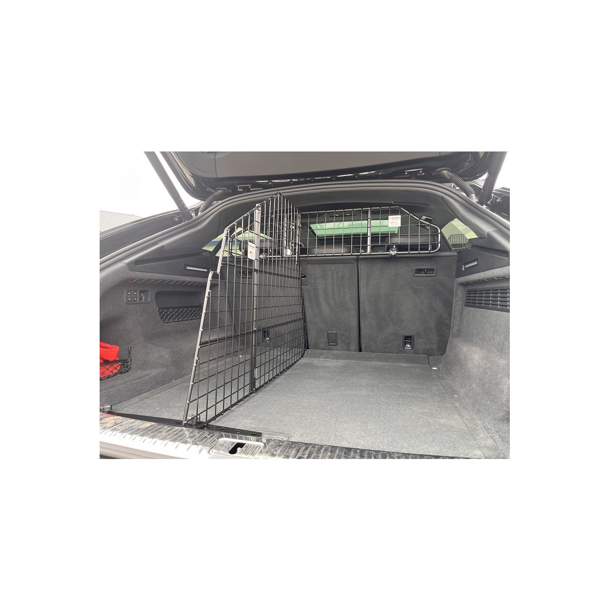 - Befestigung an das vorhandene Trenngitter hinter Rücksitzen