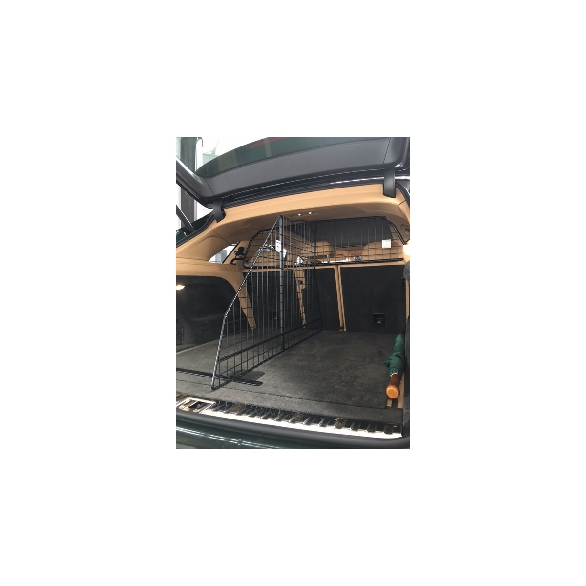 - Befestigung an das vorhandene Trenngitter hinter Rücksitzen
