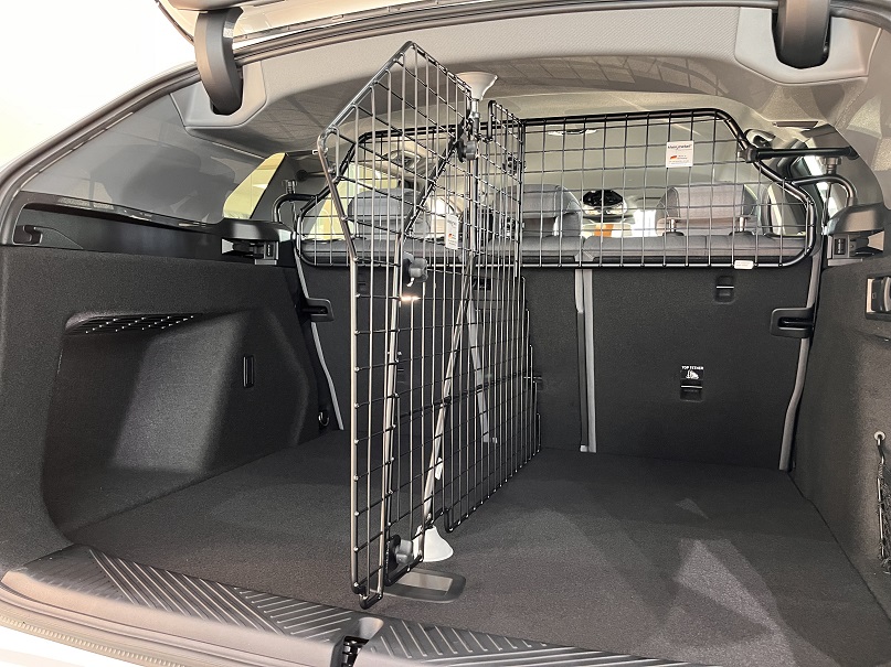 - Befestigung an das vorhandene Trenngitter hinter Rücksitzen
