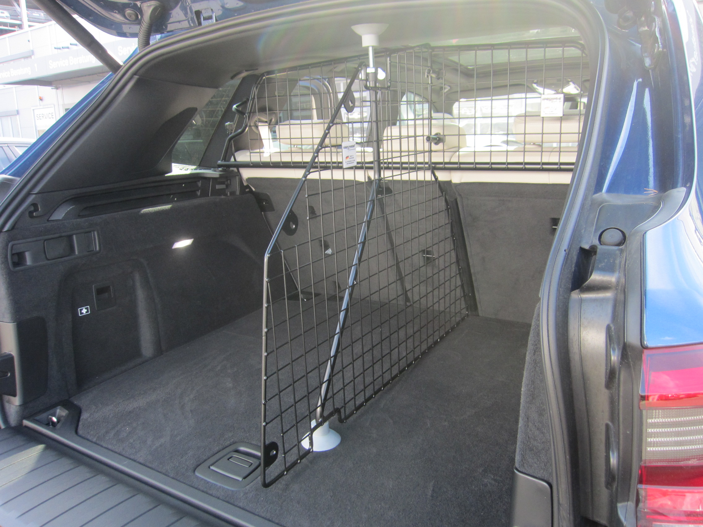 - Befestigung an das vorhandene Trenngitter hinter Rücksitzen
