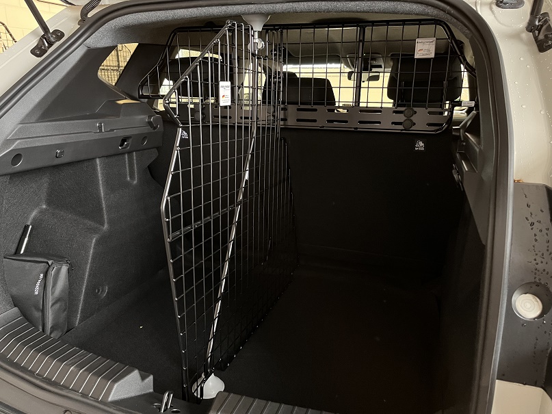 - Befestigung an das vorhandene Trenngitter hinter Rücksitzen