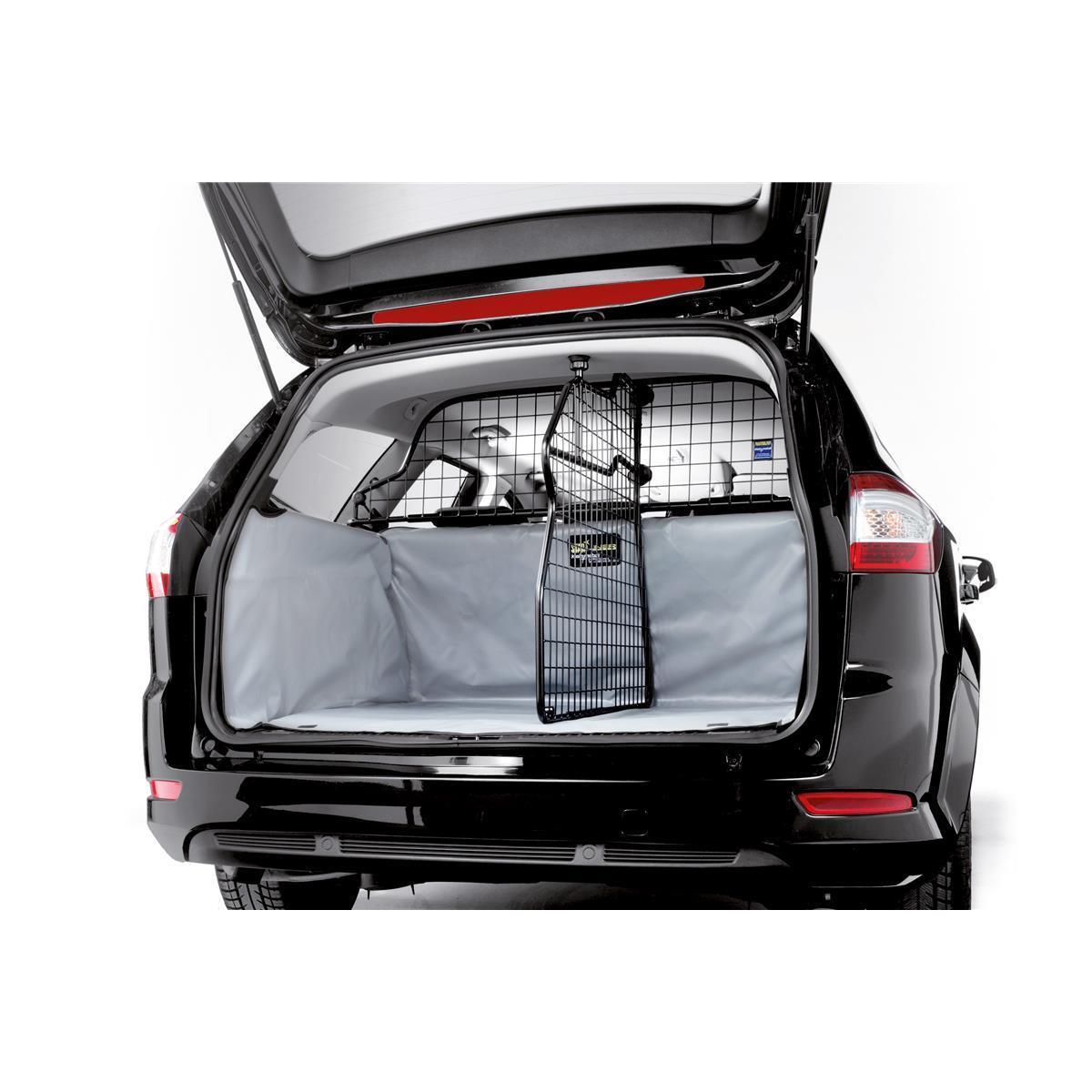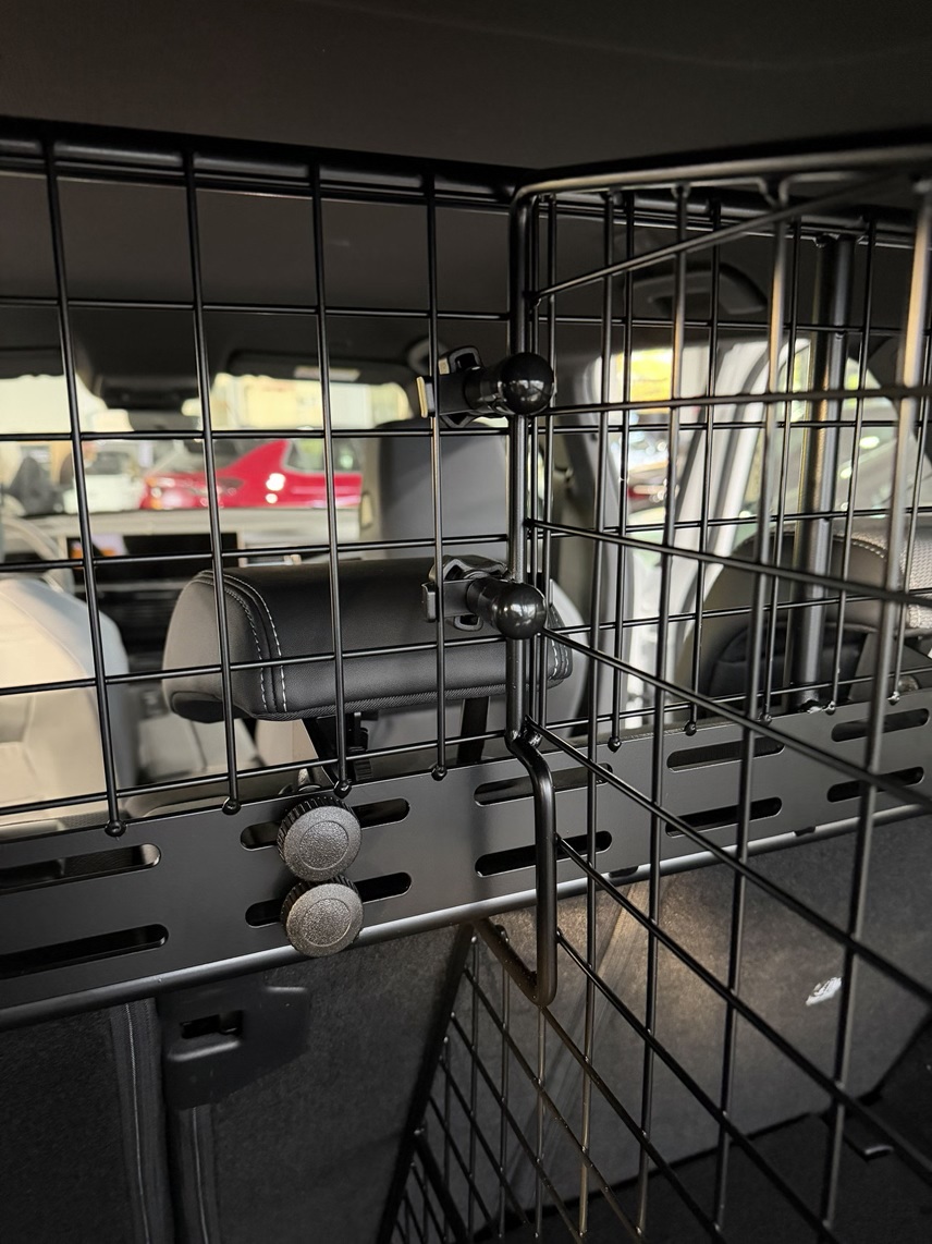 - Befestigung an das vorhandene Trenngitter hinter Rücksitzen