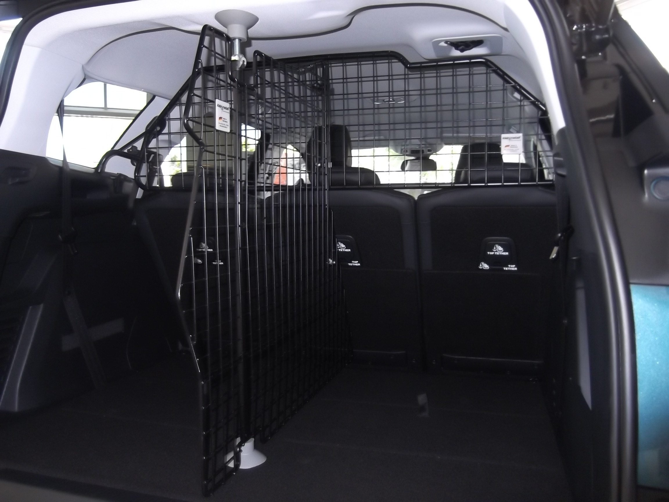 - Befestigung an das vorhandene Trenngitter hinter Rücksitzen
