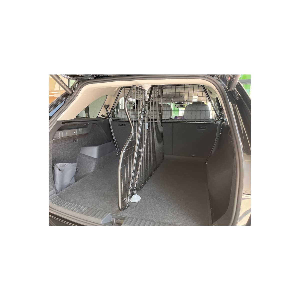 - Befestigung an das vorhandene Trenngitter hinter Rücksitzen