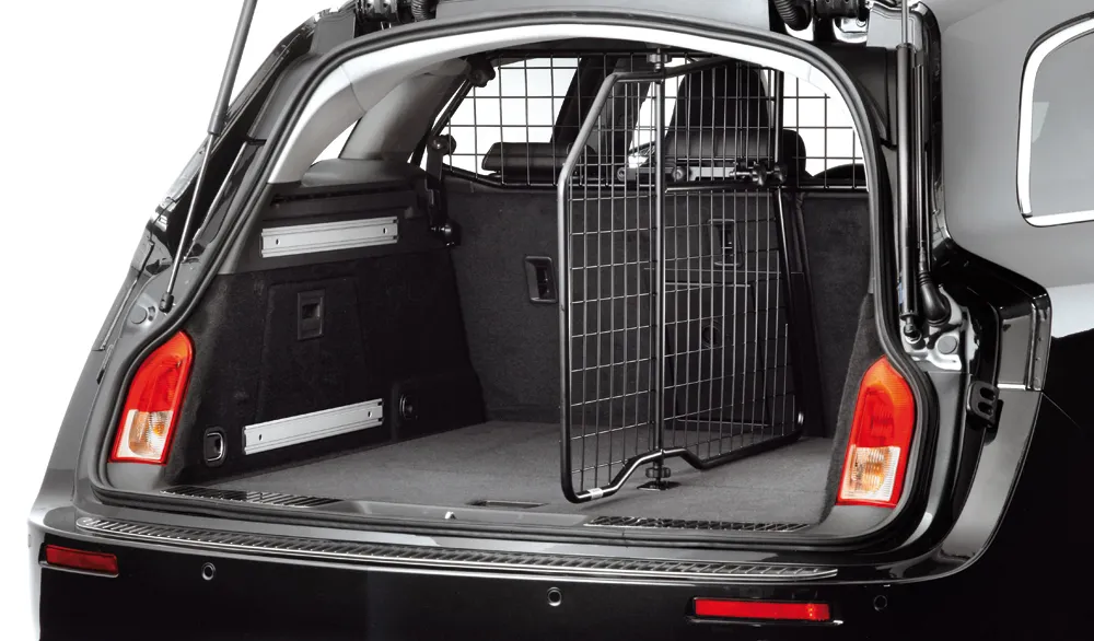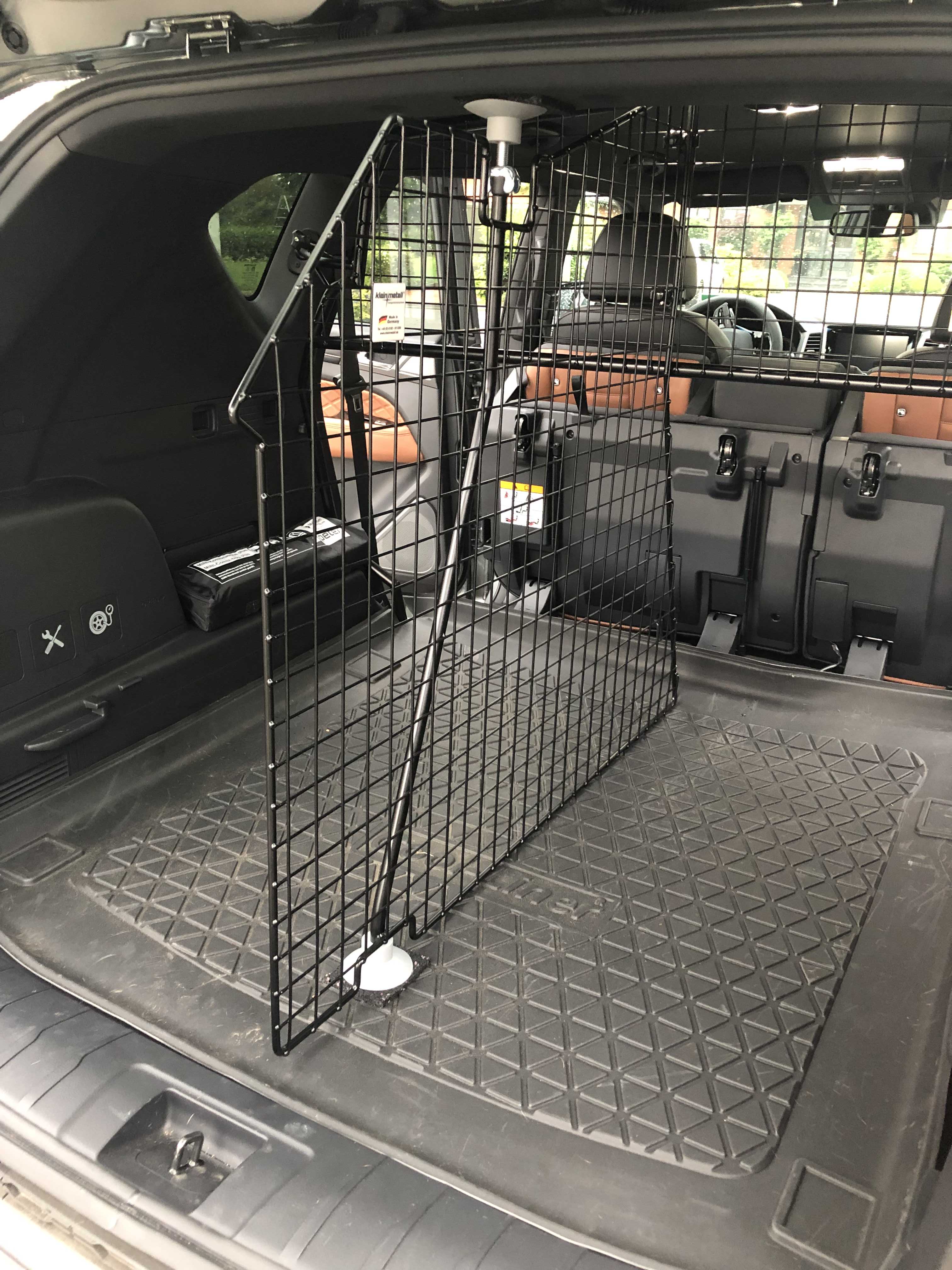 - Befestigung an das vorhandene Trenngitter hinter Rücksitzen