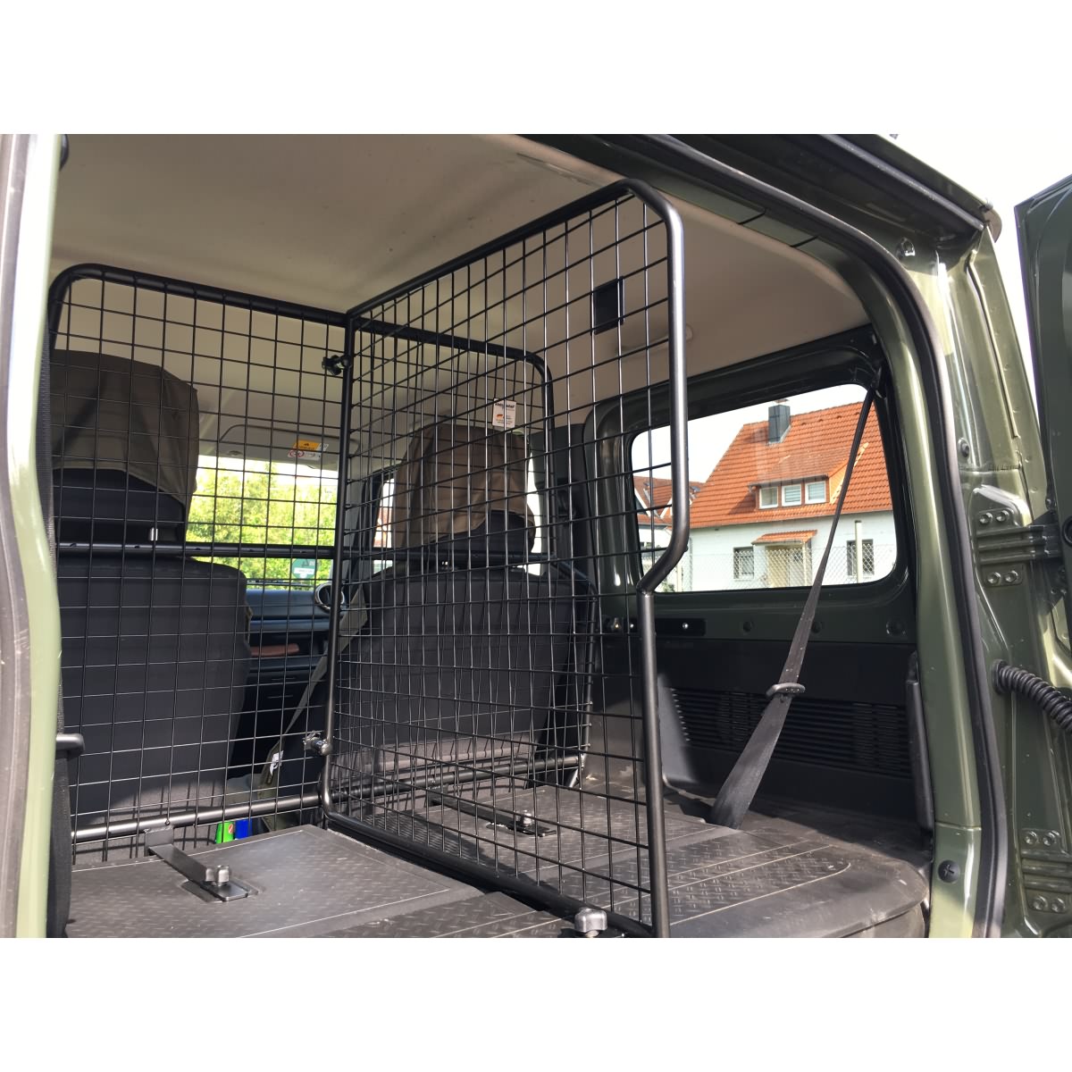 - Befestigung an das vorhandene Trenngitter hinter Rücksitzen