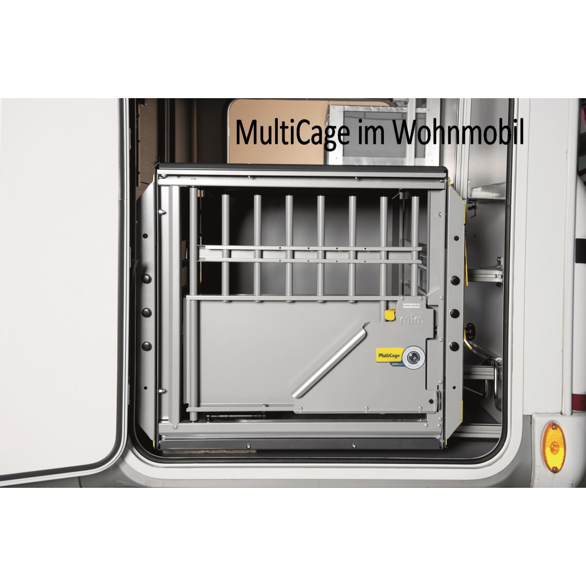 MULTICAGE hat strenge Crash-Tests durchlaufen; Dank ihrer robusten Konstruktion kann die Box auch gestapelt (gleiche Boxengröße) bzw. mit Gepäck belastet werden.